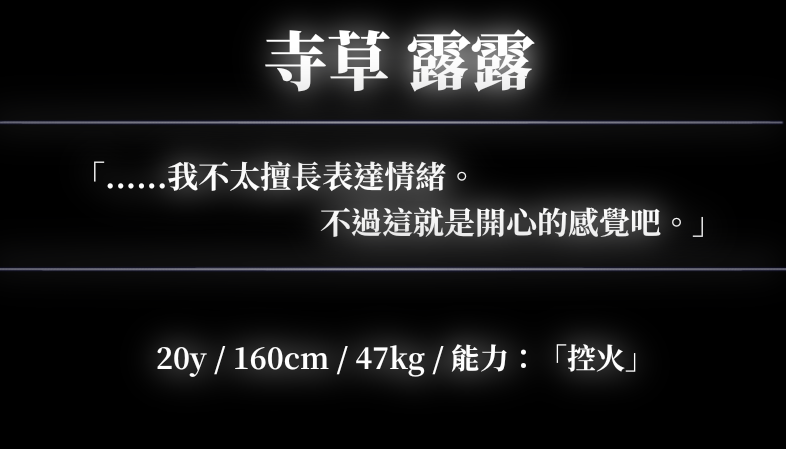 - 舉手投足之中看得出寺草家的優良教育。然而與那優雅氣質相反,總是口出惡言這點有待改進。